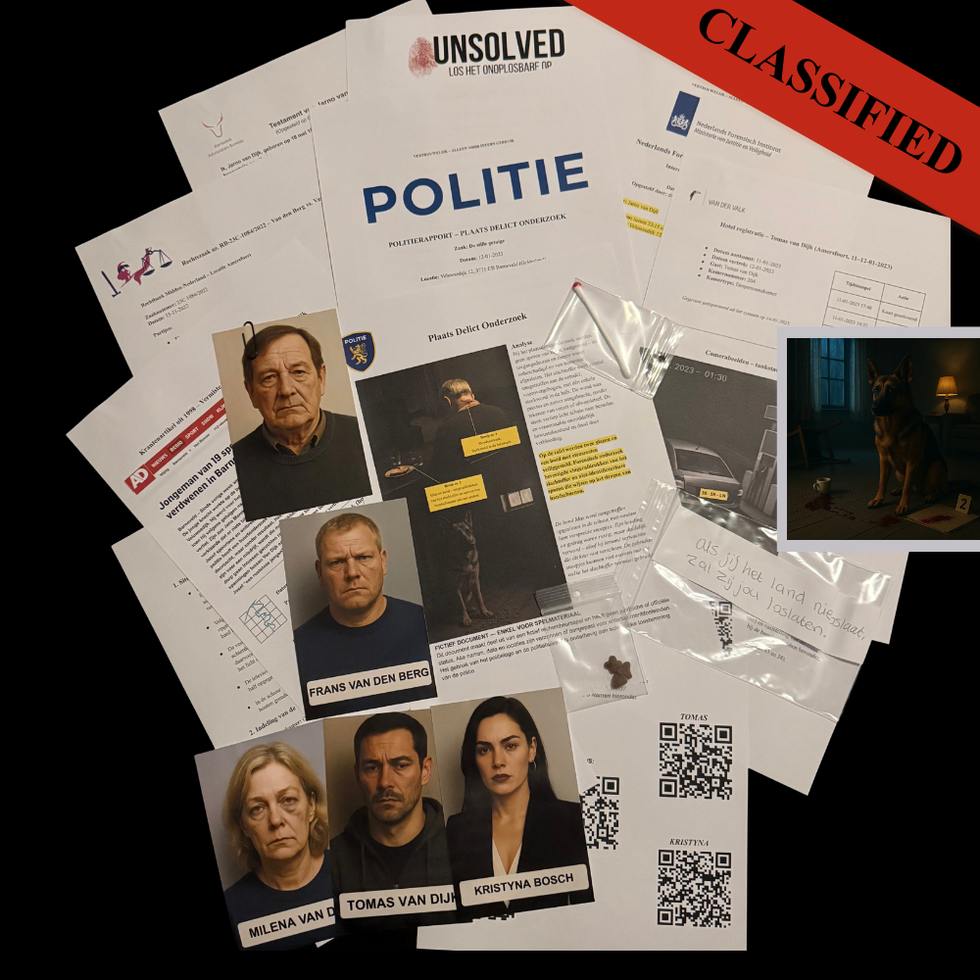 Een volledig onderzoeksdossier met realistische documenten, verhoren en bewijsmateriaal: